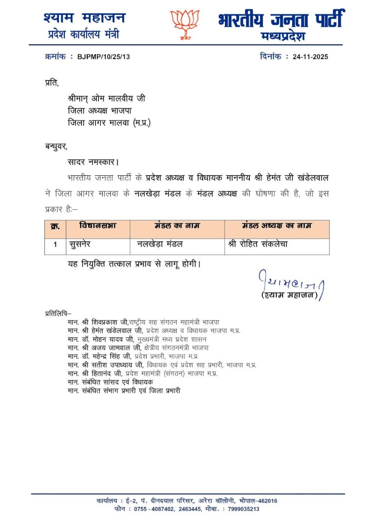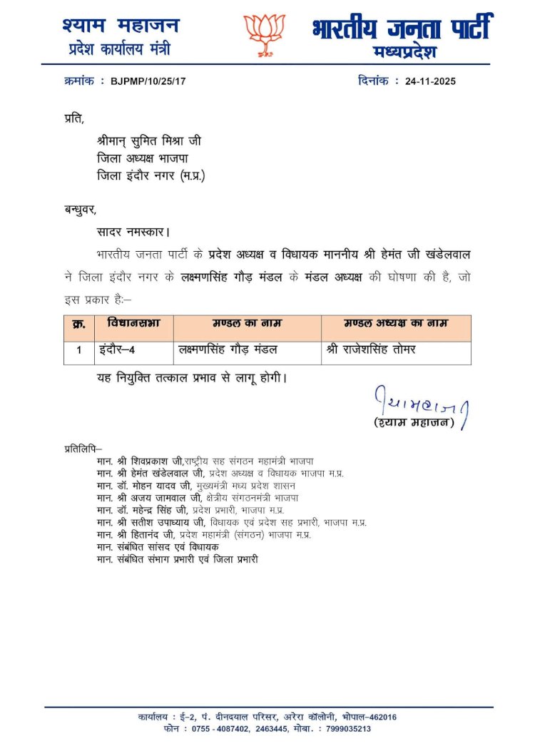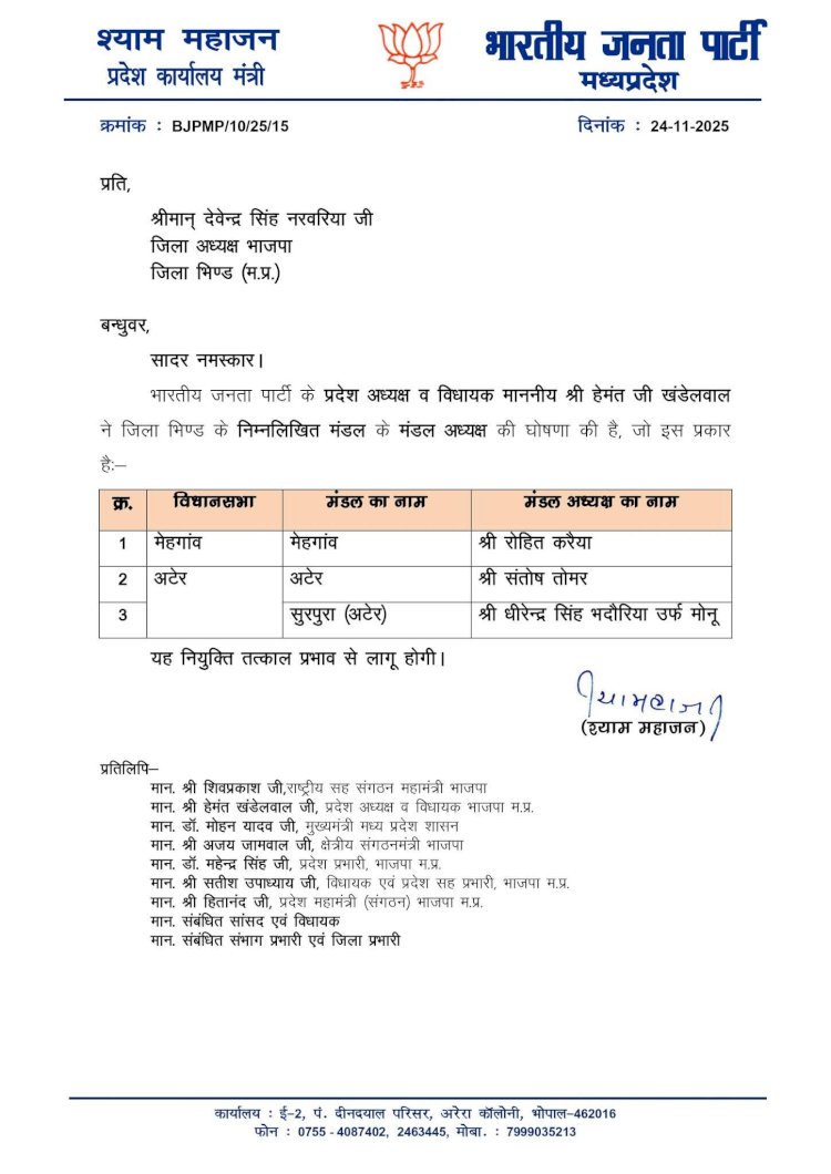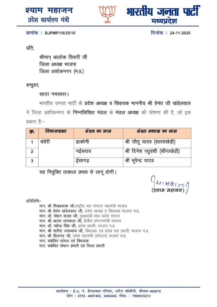 भाजपा प्रदेश अध्यक्ष हेमंत खंडेलवाल ने जबलपुर, अशोकनगर, भिण्ड, इंदौर नगर और आगर-मालवा जिलों के मंडल अध्यक्षों की घोषणा की