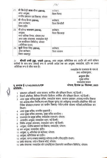 भोपाल नगर निगम कमिश्नर हरेंद्र नारायण को छिंदवाड़ा का कलेक्टर बनाया है। बीजेपी के नेताओं ने हरेंद्र नारायण पर फोन न उठाने के आरोप सार्वजनिक तौर पर लगाए थे। पन्ना कलेक्टर रहे सुरेश कुमार को मुरैना का संभागायुक्त बनाया गया है। संस्कृति जैन को भोपाल नगर निगम का कमिश्नर बनाया गया है। शिवराज के OSD रहे वशिष्ठ पांढुर्णा के कलेक्टर बने शिवराज सिंह चौहान के मुख्यमंत्री काल में उनके ओएसडी रहे नीरज वशिष्ठ को पांढुर्णा जिले का कलेक्टर बनाया गया है नीरज वशिष्ठ की गिनती शिवराज की सबसे करीबी अफसर में मानी जाती है।