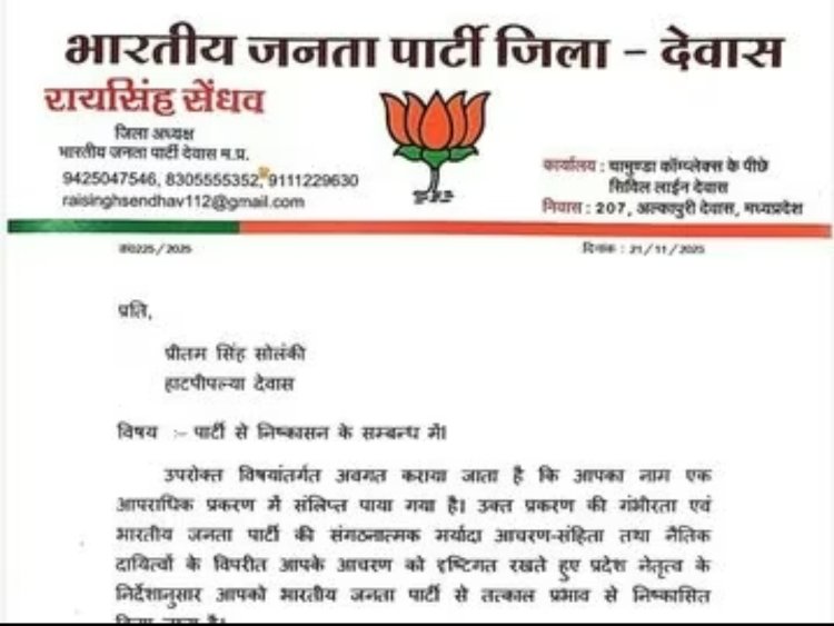 भाजपा जिला अध्यक्ष रायसिंह सेंधव ने 21 नवंबर 2025 को आधिकारिक पत्र जारी करते हुए यह कार्रवाई की है। पत्र में स्पष्ट रूप से लिखा गया है कि प्रीतम सिंह सोलंकी का नाम एक आपराधिक प्रकरण में संलिप्त पाया गया है।