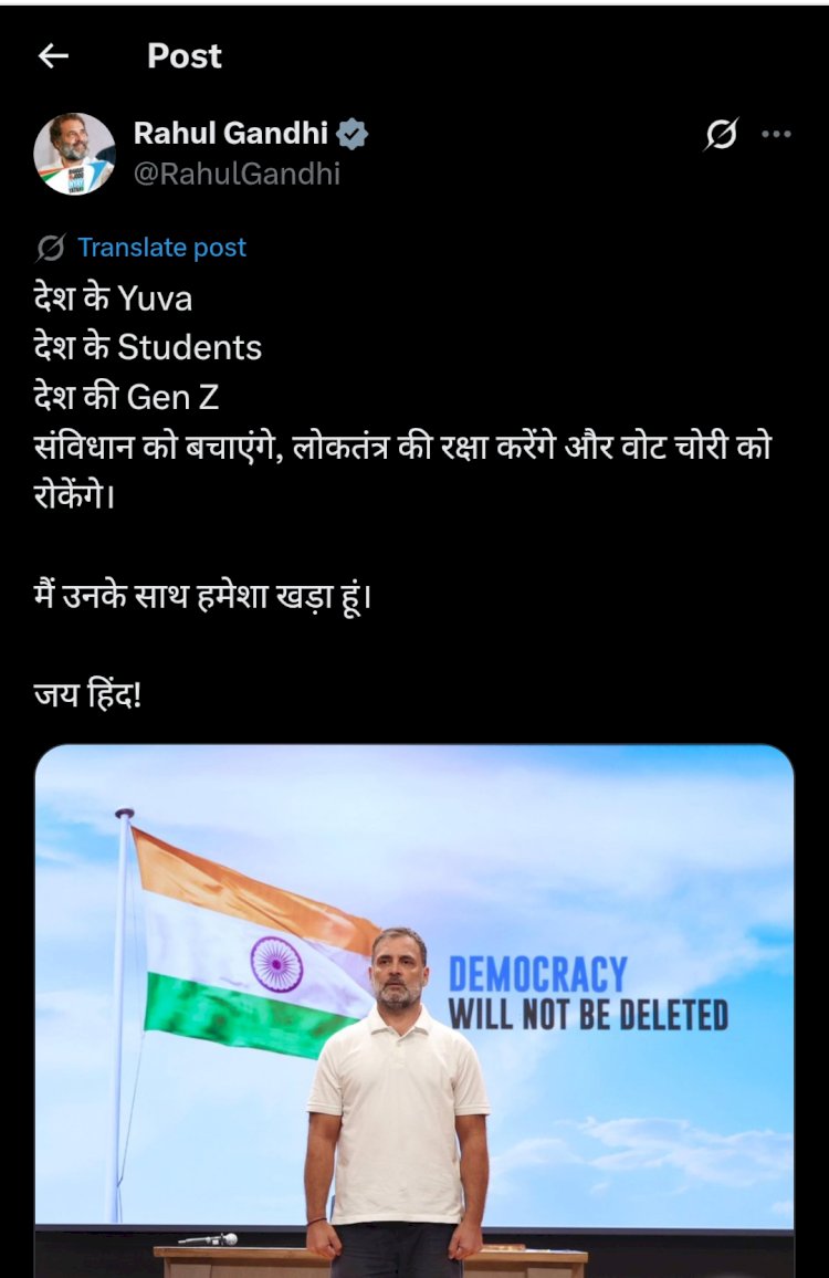 उन्होंने एक्स पर एक पोस्ट में कहा, "देश के युवा, देश के स्टूडेंट्स और देश की Gen Z संविधान को बचाएंगे, लोकतंत्र की रक्षा करेंगे और वोट चोरी को रोकेंगे. मैं उनके साथ हमेशा खड़ा हूं. जय हिंद!" . इस पोस्ट के साथ कांग्रेस नेता ने अपनी एक तस्वीर भी शेयर की है, जिसके बैकग्राउंड में लिखा है, "डेमोक्रेसी विल नॉट बी डिलीट."