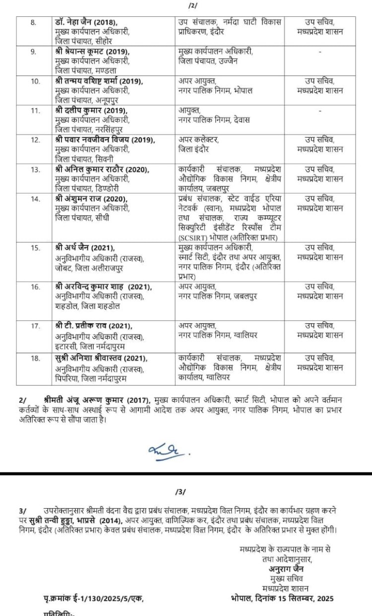 मध्यप्रदेश में एक बार फिर नौकरशाही में बड़ा फेरबदल किया गया है। राज्य की मोहन यादव सरकार ने सोमवार देर रात 18 आईएएस अधिकारियों के तबादले किए है।इसमें कई अधिकारियों को अतिरिक्त प्रभार भी सौंपा गया है। इस संबंध में सामान्य प्रशासन विभाग द्वारा जारी आदेश जारी कर दिए गए है।बता दे कि इससे पहले 8 सितंबर को मोहन सरकार ने प्रशासनिक फेरबदल करते हुए 14 आईएएस अधिकारियों को इधर से उधर किया गया था। इसमें कई विभागों के आयुक्त और सचिव बदले गए थे्। इसके अलावा कटनी, बड़वानी, आगर मालवा समेत कई जिलों में नए कलेक्टर की भी नियुक्ति की गई थी।